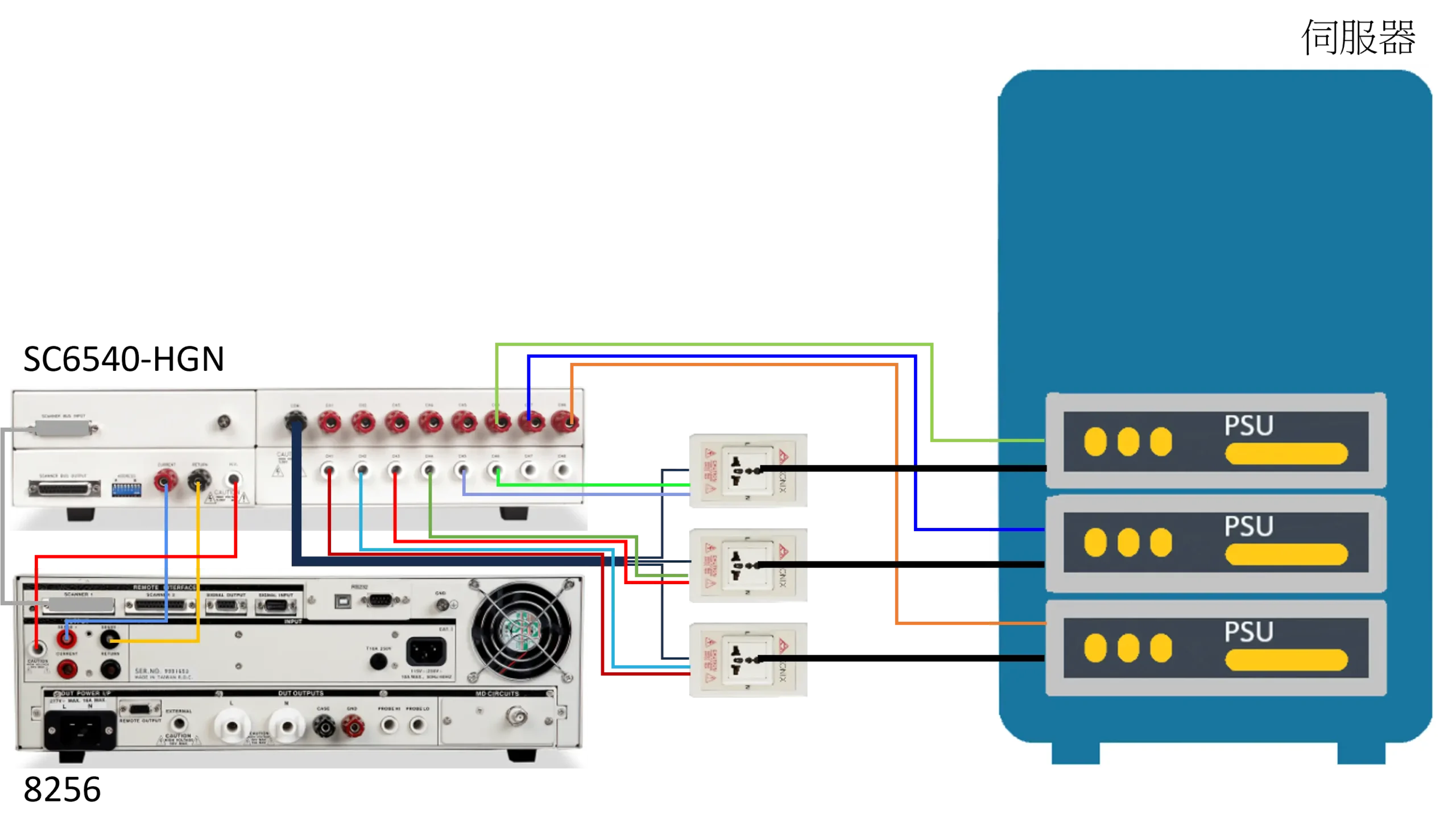 某 AI 伺服器大廠需同時連接 8 個 PSU 進行 DCW 與 GB 測試。透過 1 台 OMNIA 8206 搭配 2 台 SC6540 的系統配置,不僅成功滿足測試需求,也大幅簡化整體安規測試流程,協助產線順利因應量產挑戰。